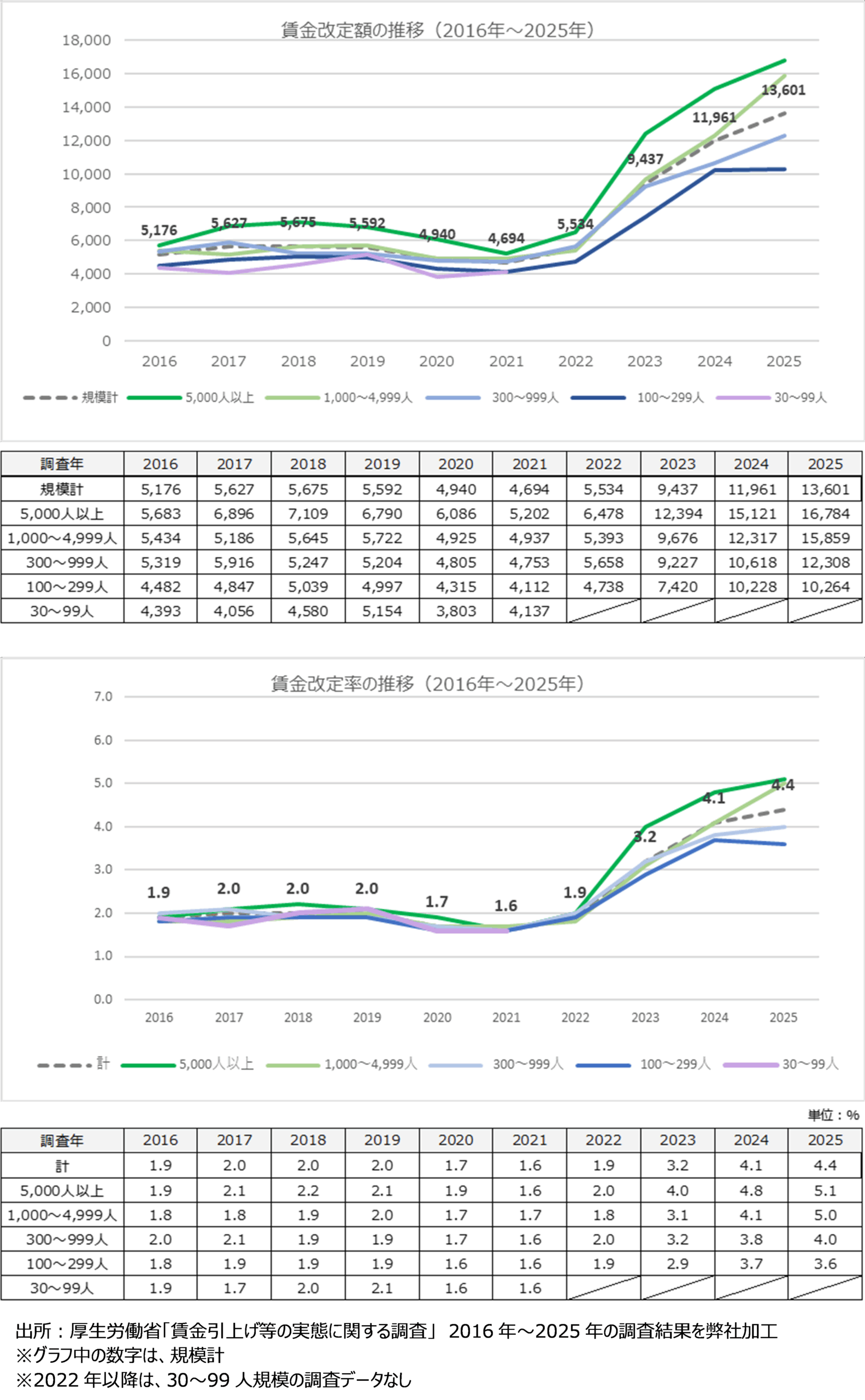 これらの推移をみると、2020年以前は、規模計の賃上げ額で5,000円台(約2%程度)でしたが、コロナ禍の2021年には4,694円(1.6%台)とやや減少、2023年から大きく上昇に転じて、9,437円(3.2%)となっています。さらに2024年には11,961円(4.1%)、2025年は13.601円(4.4%)となっており、3年連続賃上げ額が上昇を続けています。
