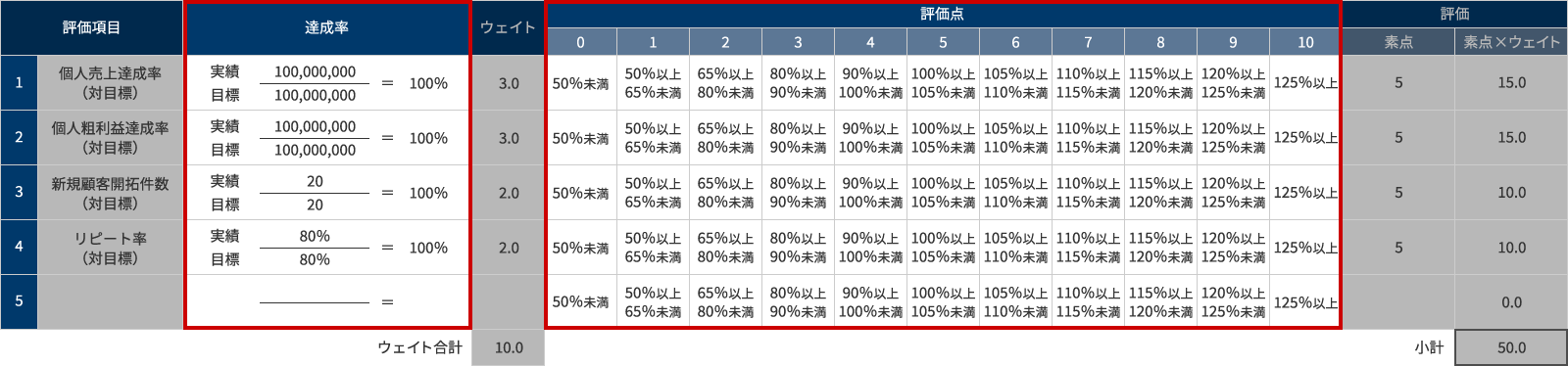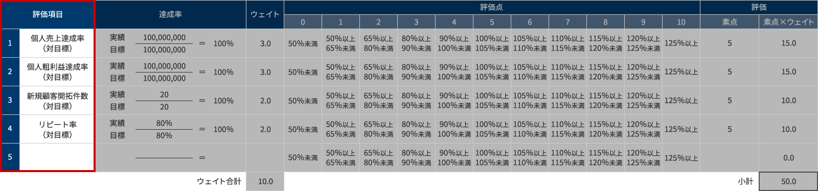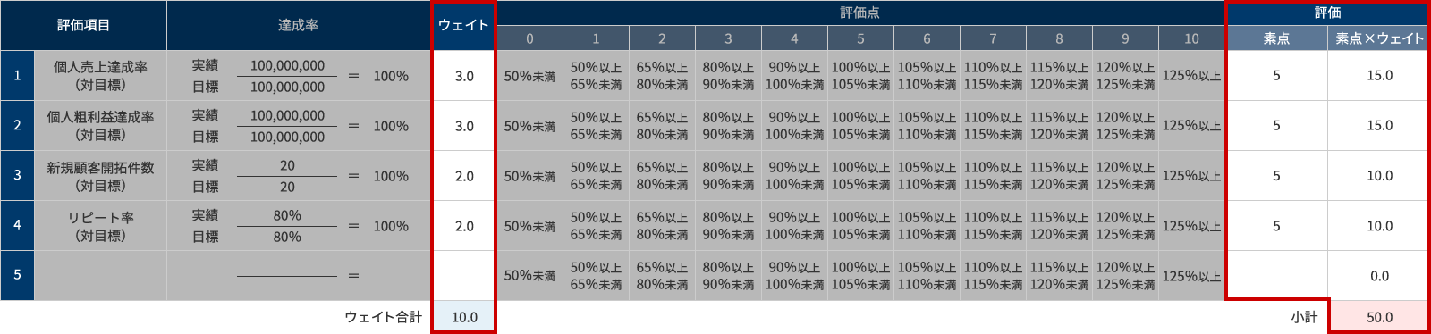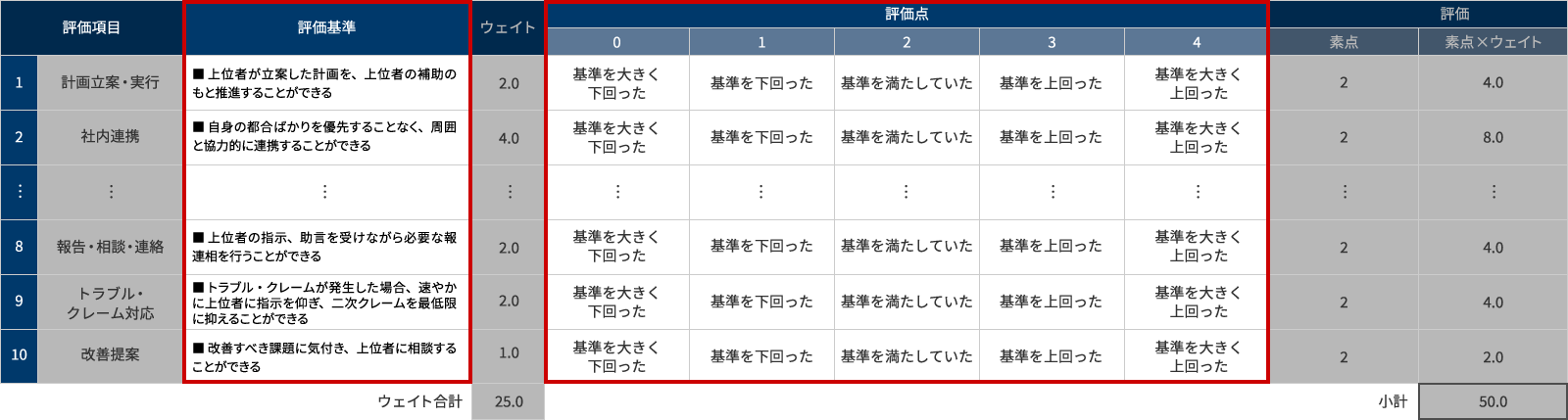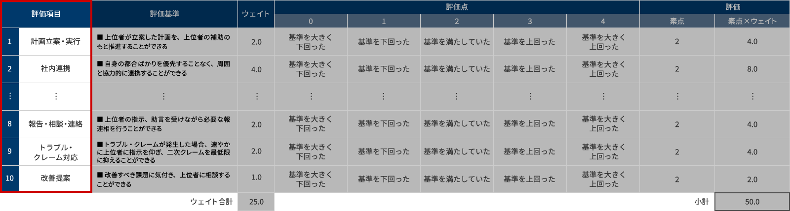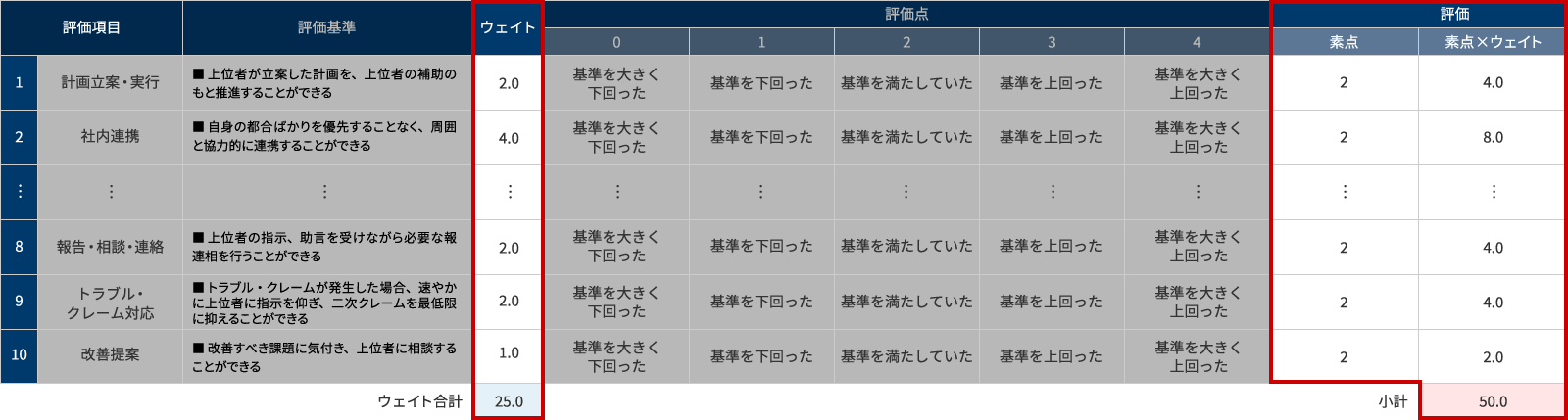 評価項目と評価基準が決まれば、次に評価項目ごとのウェイトを設定します。ウェイト設定のポイントは、評価点も考慮してウェイト合計を設定し、合計点ありきで各評価項目にウェイトを配分していくことです。例えば、評価点を0~10点の11段階としたのであれば、ウェイト合計を10と設定すると合計点が0~100点になります。合計点の位置づけを感覚的に理解しやすくするために、切りのいい合計点となるよう工夫することが肝要です。