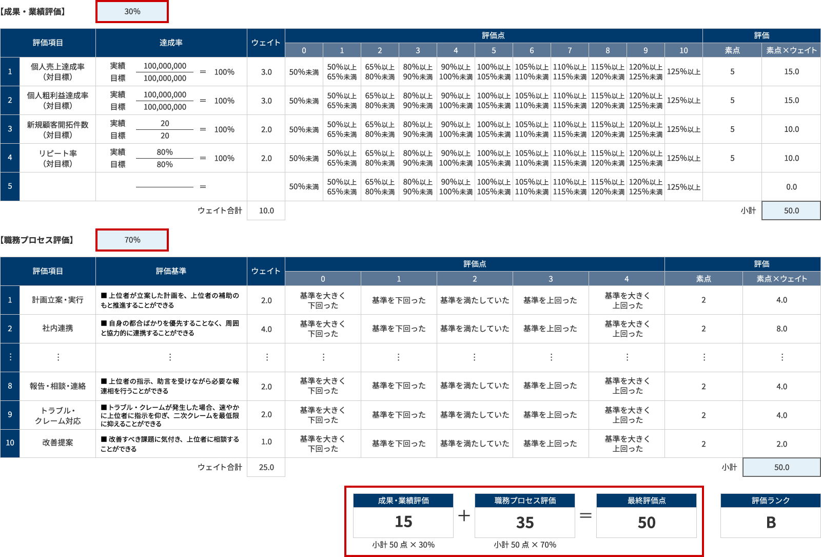 ここまで成果・業績評価と職務プロセス評価が各々100点満点となるように評価シートを設計してきました。最後に、これら2つの合計点を合算して最終評価点を算出していく必要があります。シンプルに足し算することで最終評価点を200点満点としても良いですが、それでは評価体系を整理した際の成果・業績評価と職務プロセス評価のバランスを反映することができません。そこで、「2.評価体系を整理し、評価項目を検討する」で示したウェイトで加重平均することも一案です。この工夫を行うことで最終評価点も100点満点とすることができるため、最終評価点の位置づけを感覚的に分かりやすくする上でも有効です。